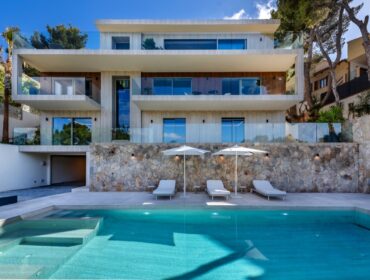 Villa orientada al sur en Santa Ponça con vistas al mar, energía solar y una perfecta combinación de diseño elegante, materiales naturales y exuberante vegetación.