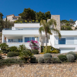 Villa orientada al sur en Santa Ponça con vistas al mar, energía solar y una perfecta combinación de diseño elegante, materiales naturales y exuberante vegetación.