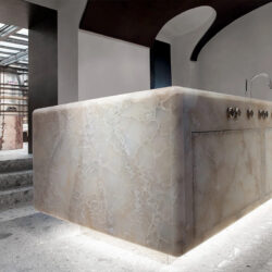 Henge es una marca italiana reconocida por convertir materiales naturales en piezas extraordinarias. Cada elemento, ya sea una mesa de comedor, un sofá, una silla, una lámpara o una instalación arquitectónica, está hecho a mano por artesanos locales utilizando materiales raros y expresivos, tales como: