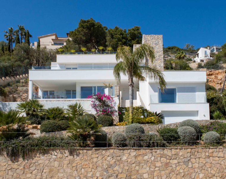Villa en Costa D’en Blanes con tres dormitorios, jardín privado, terrazas con vistas al mar, garaje y interiores modernos en una zona residencial muy cotizada.