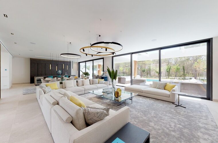 Villa contemporánea de lujo en Nova Santa Ponsa con seis dormitorios, amplios interiores, piscina climatizada de agua salada y terrazas ideales para la vida exterior.