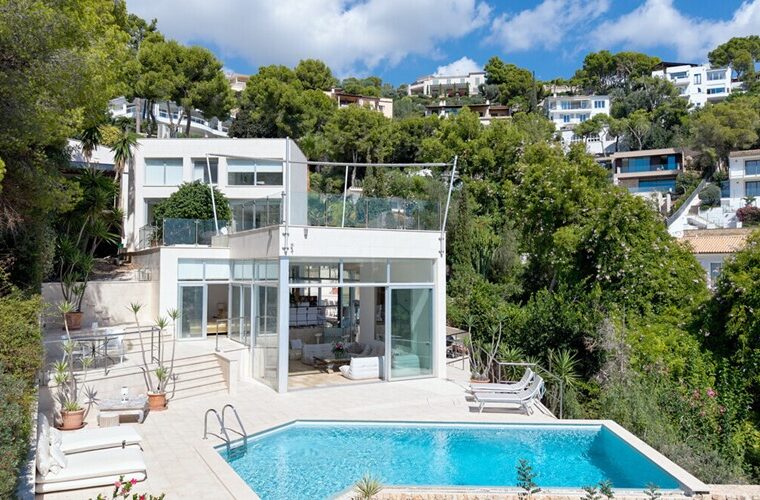 Villa moderna con vistas al mar en Santa Ponsa, con 4 dormitorios, piscina infinita, apartamento de invitados, sauna y cerca de Port Adriano y campos de golf.