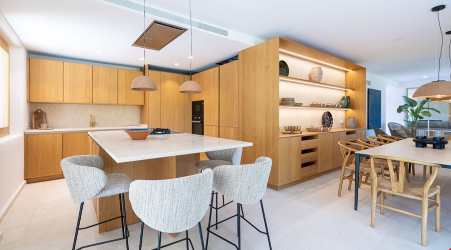 La cocina abierta con comedor refleja un gusto refinado por los detalles, equipada con electrodomésticos Miele, carpintería a medida y una cuidada combinación de texturas que rinden homenaje a la tradición mallorquina. La vivienda incluye además lavadero, aseo de invitados, bodega y zonas de almacenamiento bien pensadas como un cuarto de botas y una despensa.