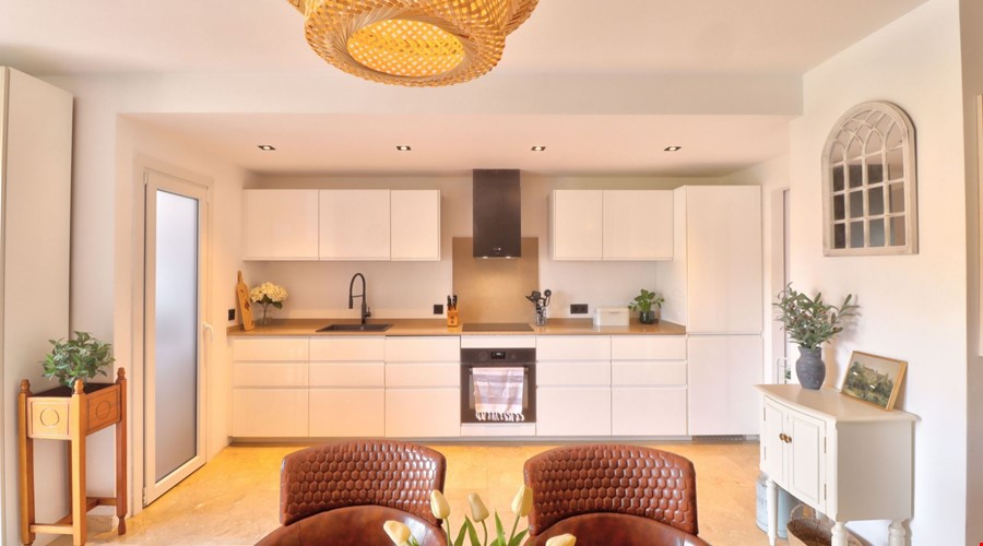 El interior ha sido rediseñado con atención al detalle, combinando funcionalidad y confort. La planta superior está dedicada a la vida diaria, con un espacio abierto que integra salón, comedor y cocina. Grandes aperturas conducen al balcón, permitiendo que la luz natural fluya libremente y creando una conexión fluida entre interior y exterior. La cocina, de estilo moderno, se integra de forma natural en el espacio, ideal tanto para el día a día como para recibir invitados.