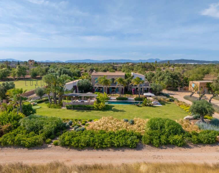 Finca de lujo cerca de la playa de Es Trenc con vistas panorámicas al mar, piscina privada y jardines paisajísticos, que ofrece una mezcla única de diseño moderno y tradicional.