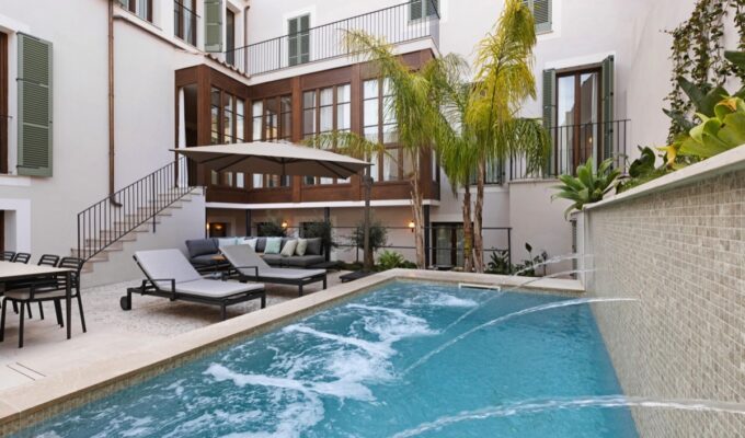 Una prueba de su talento para transformar una propiedad en algo verdaderamente excepcional es su trabajo en la renovación de una vivienda familiar en Palma, conocida como GSB. «Al principio, los propietarios solo querían pintar la casa y cambiar algunas cosas», recuerda con una sonrisa, «pero poco a poco se fueron animando, hasta que acabamos haciendo una renovación completa». El resultado es una residencia que equilibra la elegancia con la calidez, definida por líneas suaves y redondeadas y el ritmo natural de la piedra y la madera. Una espectacular chimenea con una base de piedra rústica preside la sala de estar principal, su presencia suavizada por vigas de castaño y la suave luz de las pantallas de lámparas esculturales. Las altas puertas de roble y las incrustaciones de latón añaden una sutil sofisticación, mientras que la sala de cine y el espacioso porche reflejan la importancia del confort y la vida familiar. «Algunas propiedades realmente necesitan el toque mallorquín», dice, refiriéndose a las vigas de madera y las paredes revestidas de piedra, «y otras no».