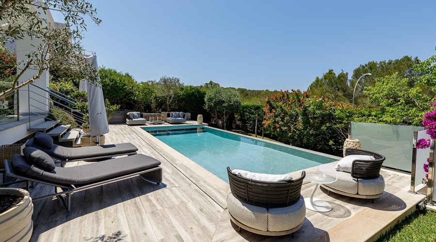 Ubicada en una parcela de 1.000 m², la villa ha sido concebida para disfrutar del exterior con total comodidad. En el centro del jardín se encuentra una piscina privada, rodeada de terrazas soleadas y vegetación mediterránea, creando un entorno ideal para las largas tardes de verano bajo el cielo mallorquín.