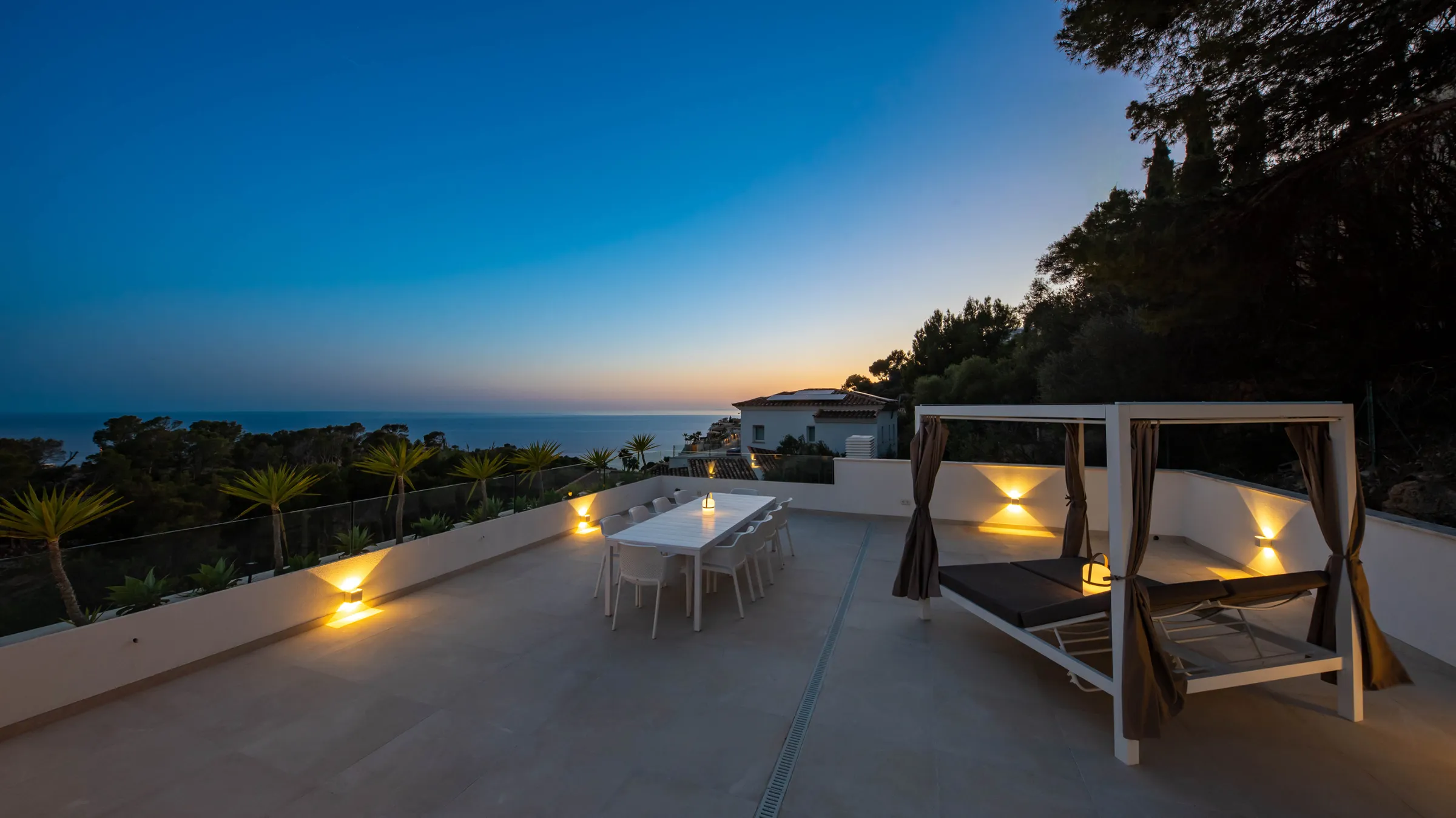 La villa se encuentra en una parcela de aproximadamente 1.000 m², con múltiples terrazas que ofrecen vistas elevadas al mar y a las colinas circundantes. El exterior incluye piscina, solárium y áreas ajardinadas pensadas para la relajación. La terraza en la azotea ofrece zona de estar, cocina exterior y jacuzzi, creando un espacio ideal tanto para el entretenimiento como para disfrutar de la tranquilidad mientras se contempla la costa. Se dispone de garaje cubierto y plazas de aparcamiento adicionales para mayor comodidad de residentes y visitantes.