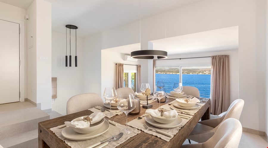 La villa se distribuye en dos niveles. La planta superior está dedicada a un espacio abierto de salón y comedor enmarcado por amplios ventanales con vistas al mar. La cocina de diseño italiano combina funcionalidad y estilo, creando un ambiente acogedor tanto para el día a día como para recibir invitados. En la planta inferior, dos dormitorios confortables y dos baños contemporáneos ofrecen un refugio tranquilo. El diseño realza la luz natural y los espacios fluidos, subrayando el carácter sereno y costero de la vivienda.