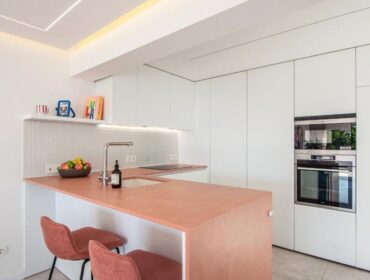Esta moderna villa en Cala Vinyes ofrece una impresionante terraza en la azotea con vistas panorámicas al mar y a la montaña y espacios de vida interiores y exteriores sin fisuras.
